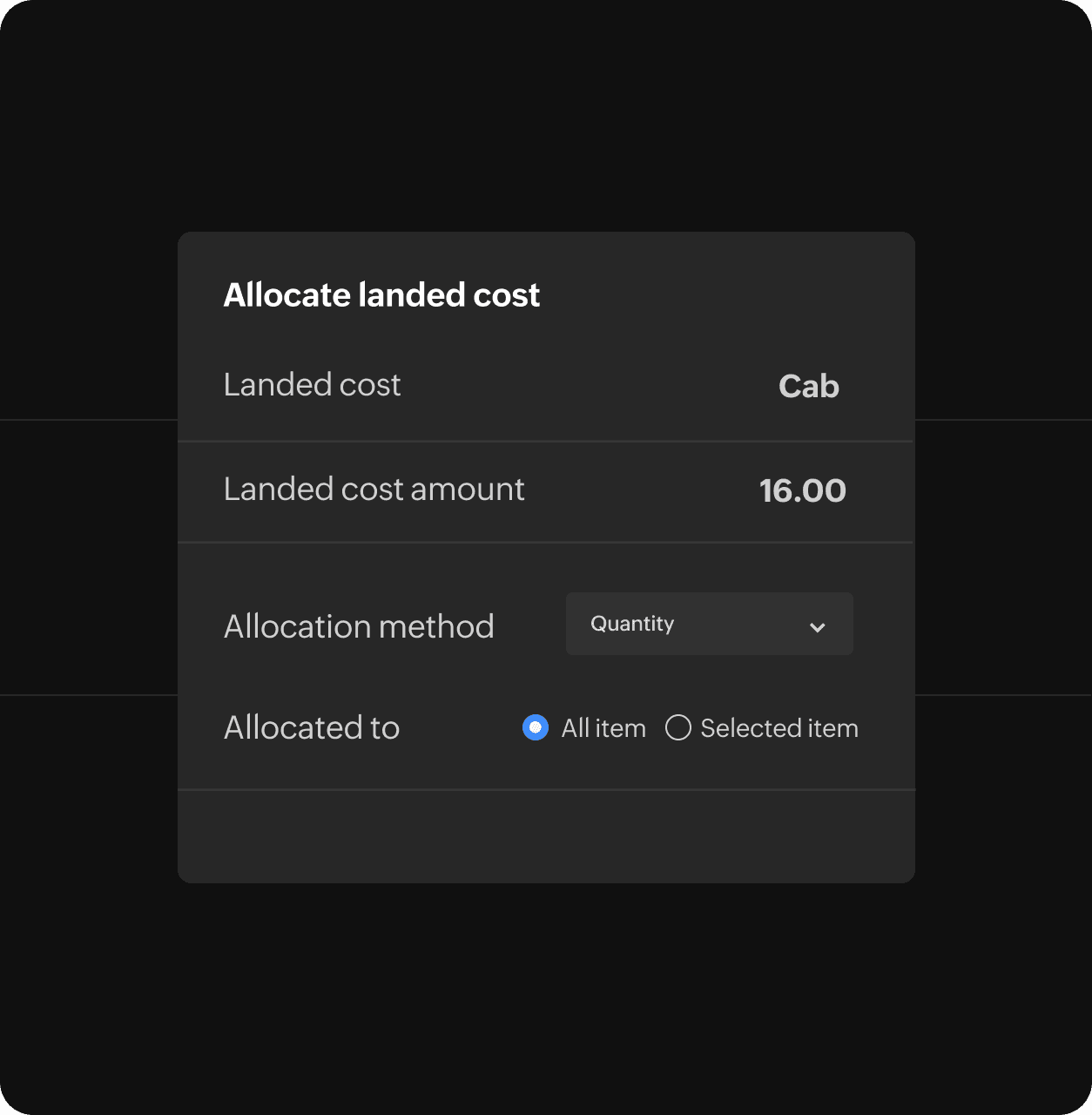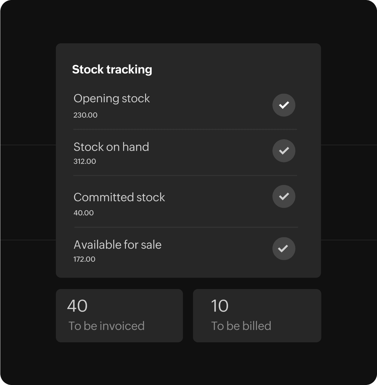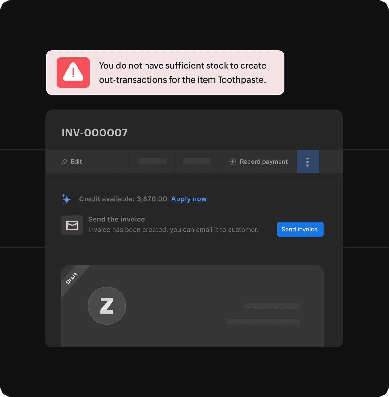 Learn stock availability as you raise invoices or other transactions, and see Zoho Books populate the relevant prices, taxes, and other details, saving valuable time. Easily add items in bulk, too.